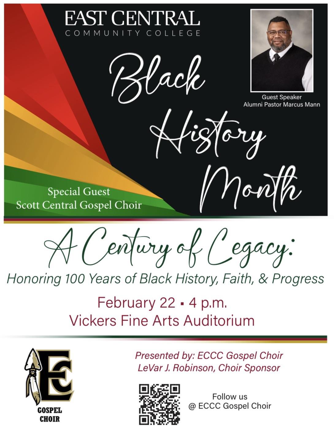 The program, titled “A Century of Legacy: Honoring 100 Years of Black History, Faith, & Progress,” will feature guest speaker and ECCC alumnus Pastor Marcus Mann, along with a special performance by the Scott Central Gospel Choir. The event is presented by the ECCC Gospel Choir under the direction of sponsor LeVar J. Robinson.