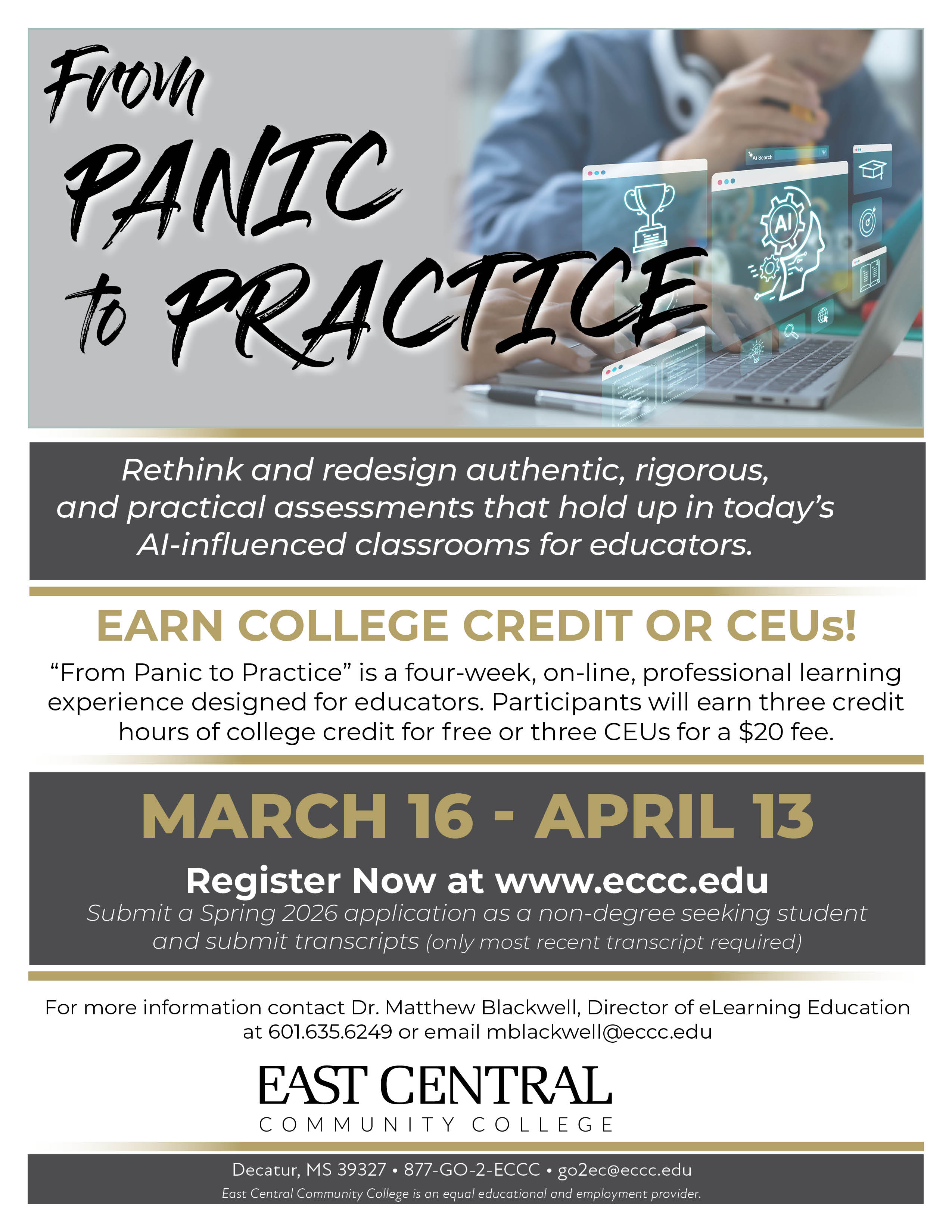For additional information, contact Dr. Matthew Blackwell, Director of eLearning Education, at 601-635-6249 or mblackwell@eccc.edu or by seeing the flyer below.
